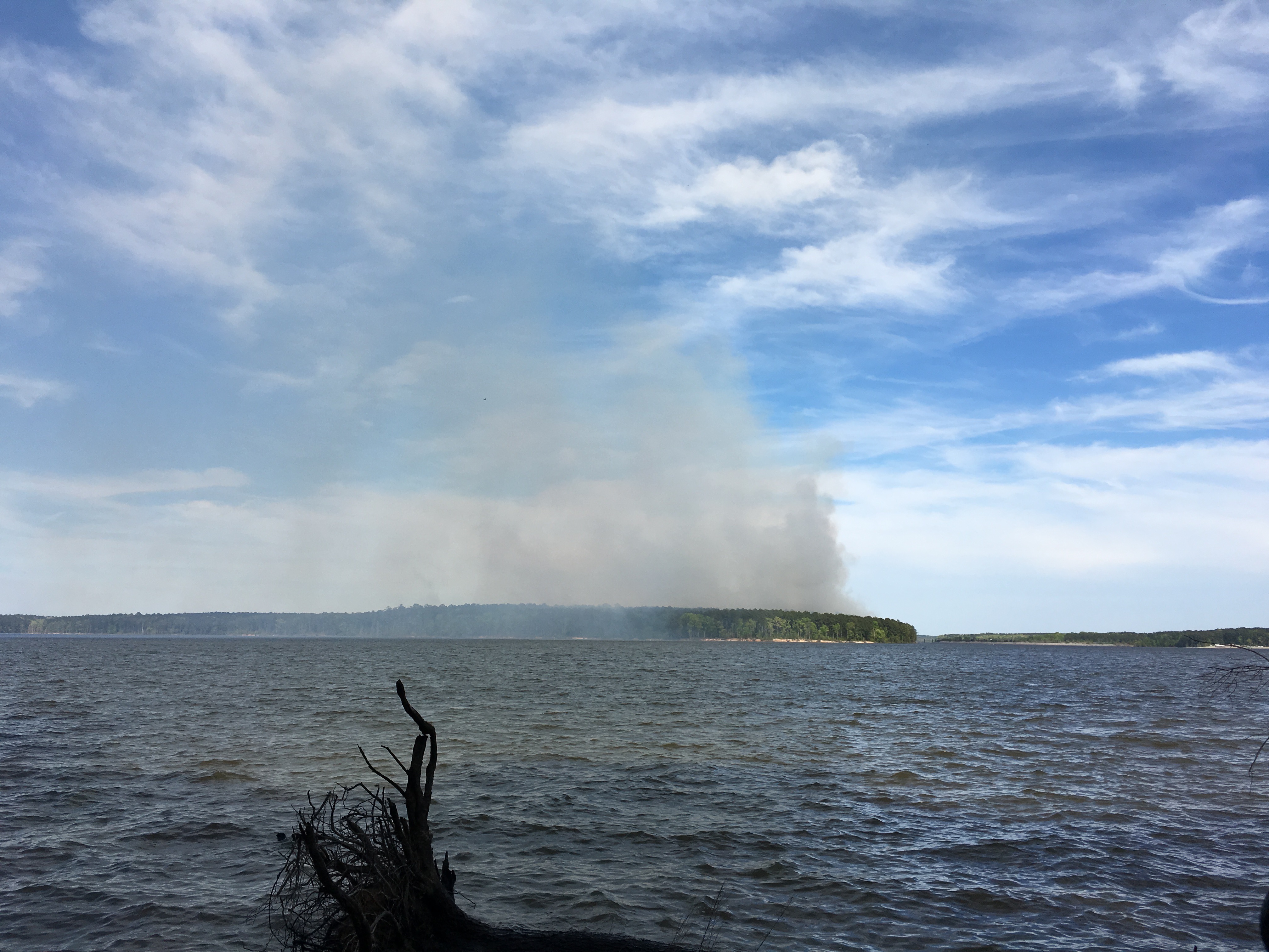 I was at the lake all day today, along with several other people, monitoring the prescribed burn. I saw both parents and at least 1 of the chicks prior to the start of the burn. We were watching from almost a mile away and cannot tell the chicks apart – so we may have seen both chicks but didn’t know that we did. It was obvious that the parents noted the humans under their nest and one would sometimes stay in the nest while the other parent circled closely above the nest. The fire was started late in the morning. During the burn we could sometimes see one or both of the parents on limbs above the nest or in the nest. I was pleased to see that the parents were staying close to the nest and not wanting to just fly away. Once the burn was well started we could not easily see the nest. By late evening a lot of the smoke had dissipated and we could see one parent at the nest. Please understand this does not mean that something had happened to an adult or a chick just because we could not see them. From our long distance it appeared that the nest and nest tree was intact. There will be a eaglet/nest check tomorrow and in the following days. I’ll be there tomorrow very early. Will continue the updates. The photo is of the peninsula early this afternoon. THANKS to all of you for your thoughts and calls and emails – thanks from the EAGLES especially.