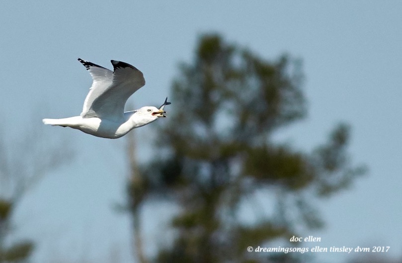 A ring-billed gull with a mouthful of fish fresh caught on the surface of the lake.