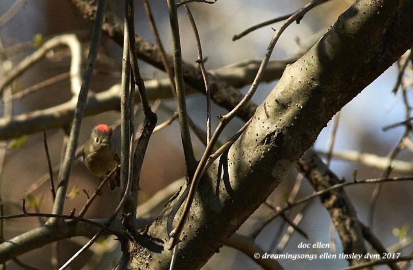 Here is the other kinglet. A ruby-crowned kinglet popping his ruby-crown at me when I startled him.