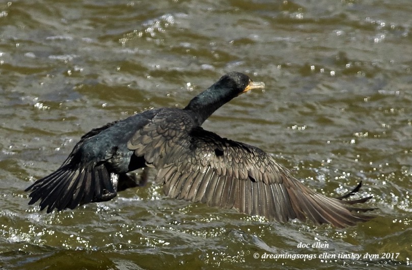 double-crested cormorant resplendent in its green black body and neck, accented by the bronze of its wings