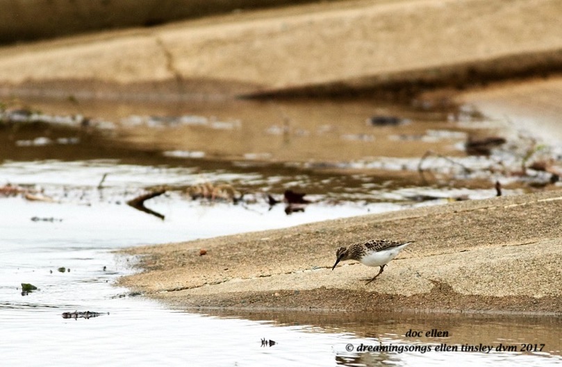 This tiny least sandpiper has walked down about 4 feet on one of the concrete ramps where he reached water.