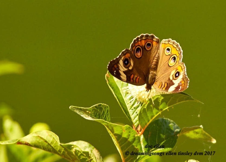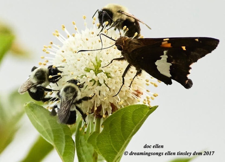 A Silver-spotted Skipper butterfly sharing a button bush blossom with some Eastern Bumblebees.