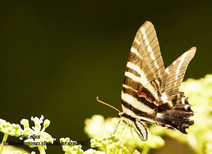 The zebra swallowtail butterfly is the only swallowtail in our region with white stripes.