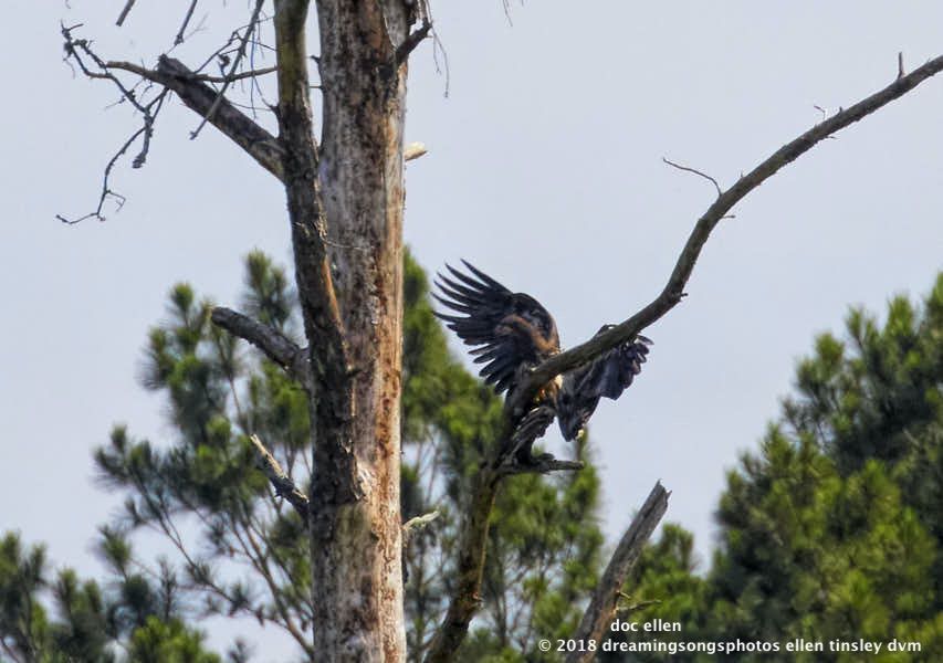 Landing are the difficult part of flight – whether you are bird or pilot. The fledgling came back in from his first flight. Dad Ranger had brought a fish to the nest. No way was the fledgling going to let his sibling, who hadn’t fledged yet, have a single bite of the fish. Only, oops, the fledgling misjudged his landing by several feet and ended up on a branch below the nest. Even an adult eagle would have trouble launching from underneath the nest and flying upwards. So, what to do? Well, if your wings aren’t going to get you out of the fix, climb…yep, climb back up to the nest.