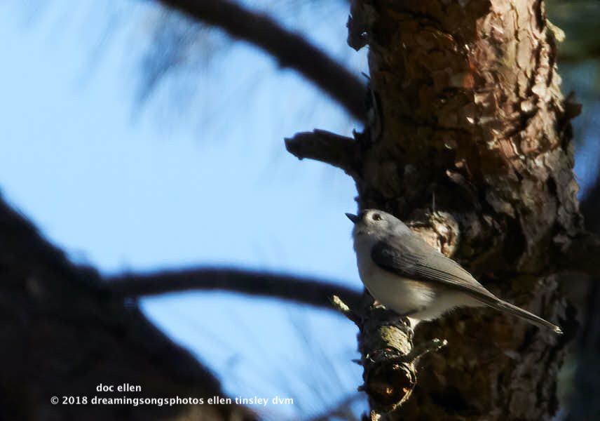 Having found a patch of sunlight and using the trunk of the pine tree as a block to the wind, this tufted titmouse is warm.