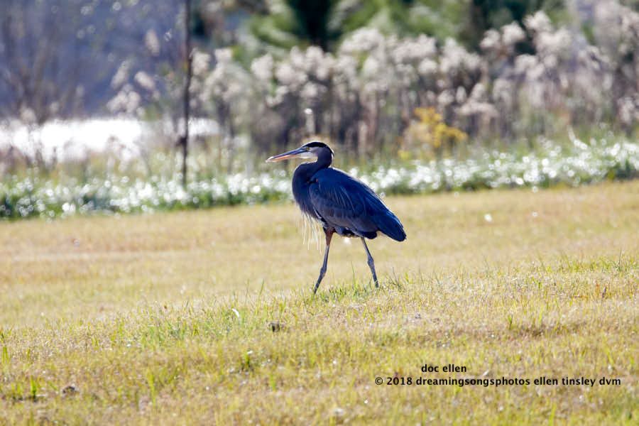 This great blue heron, while stalking a rival, has done just what the smaller birds do, and become well-rounded and fluffed against the cold.