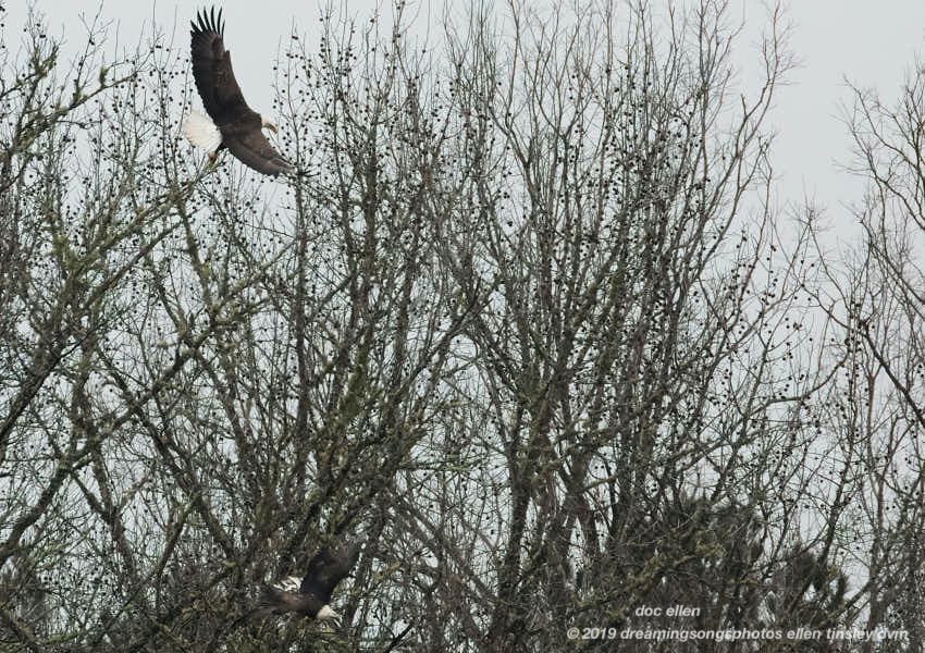 The 4-1/2-year-old eagle with its back to you has decided he wants the perch the other eagle has already landed on. Hah!