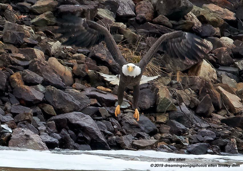 The eagle bent away from the heron, pulled up his feet and went around for another try.