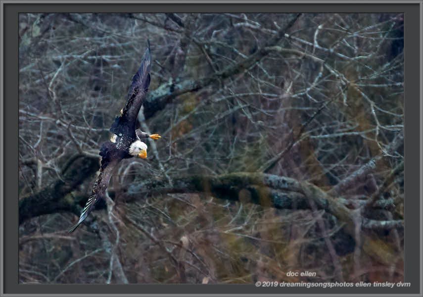 This 4-year-old bald eagle is using some of his feathers on the outer edges of his wing tips as ailerons to control his roll.