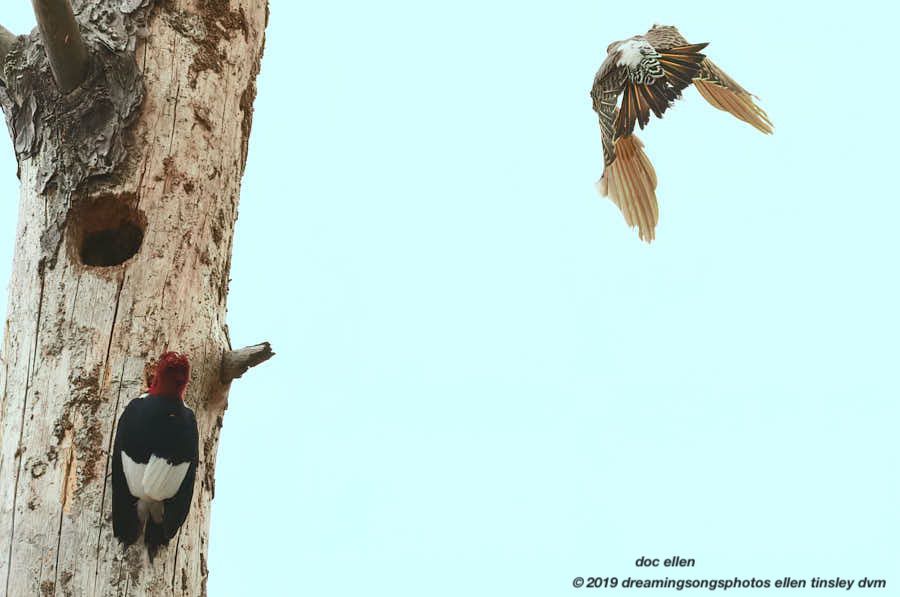 The red-headed woodpecker often drills more than one nest cavity before deciding which one to use.
