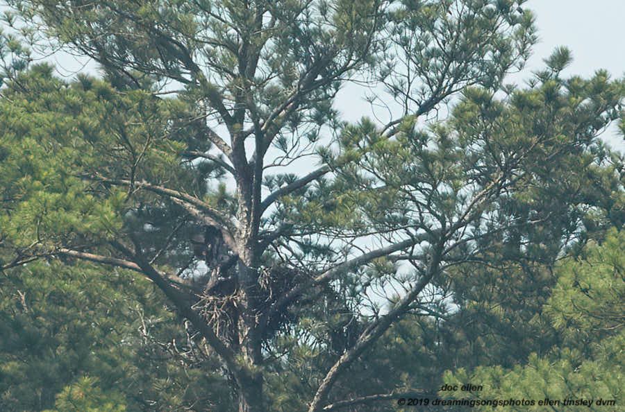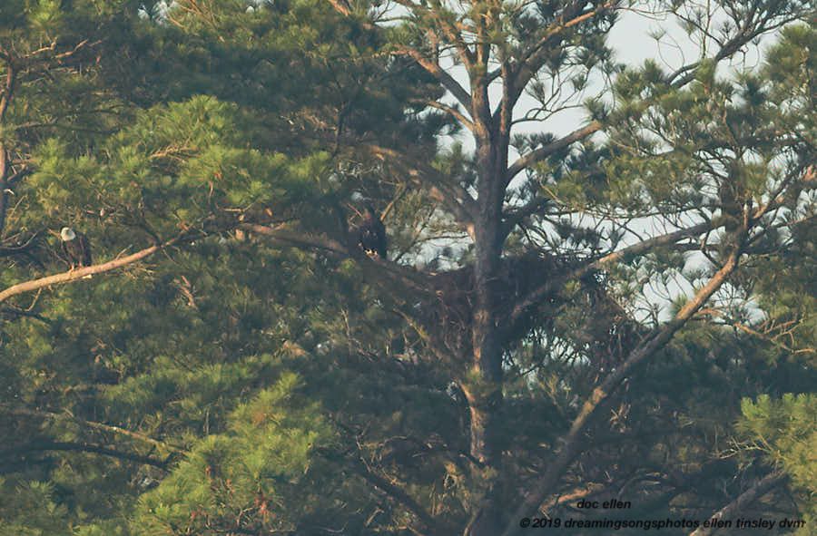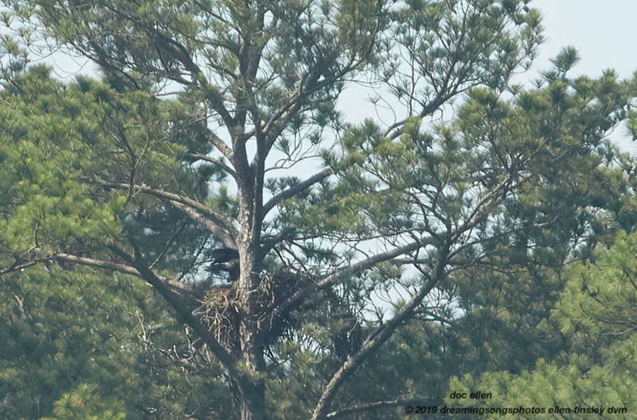 I found Godiva sitting to the far left. One chick on the rim of the nest. One chick to the far right on a branch.