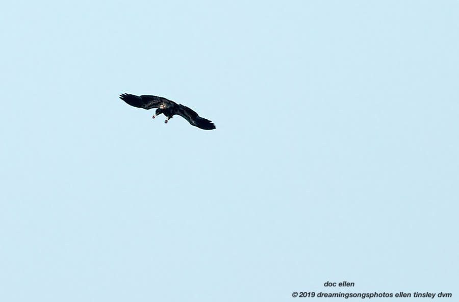 The fledgling flew, circled, got tired and even though about 500 feet from the nest, dropped his feet for landing.