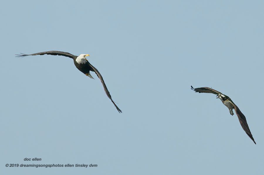 An adult bald eagle was dashing toward dad osprey (unseen here) and wanted his fish.