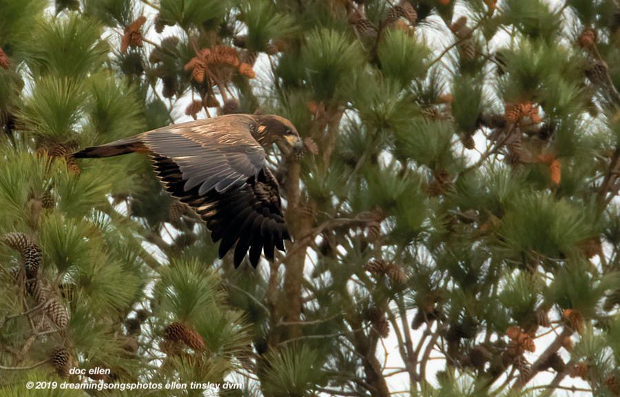 I had been watching a great blue heron on the shoreline fishing. Suddenly the fish were forgotten as the great blue heron looked almost straight up. I looked up too. The fledgling eagle looked down, seemed to not be impressed with the great blue heron and the eaglet flew on.