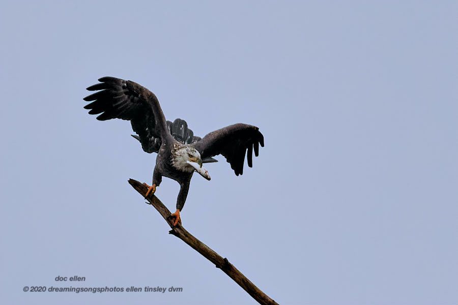 Usually bald eagles carry things such as a fish or a stick for the nest with their talons. Sometimes however, they readily, easily pick things up with their powerful beaks. This beautifully marked 3-year-old bald eagle brought his fish to his eating perch by carrying it with his beak.