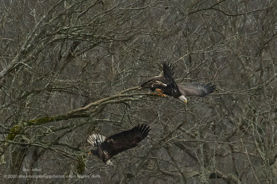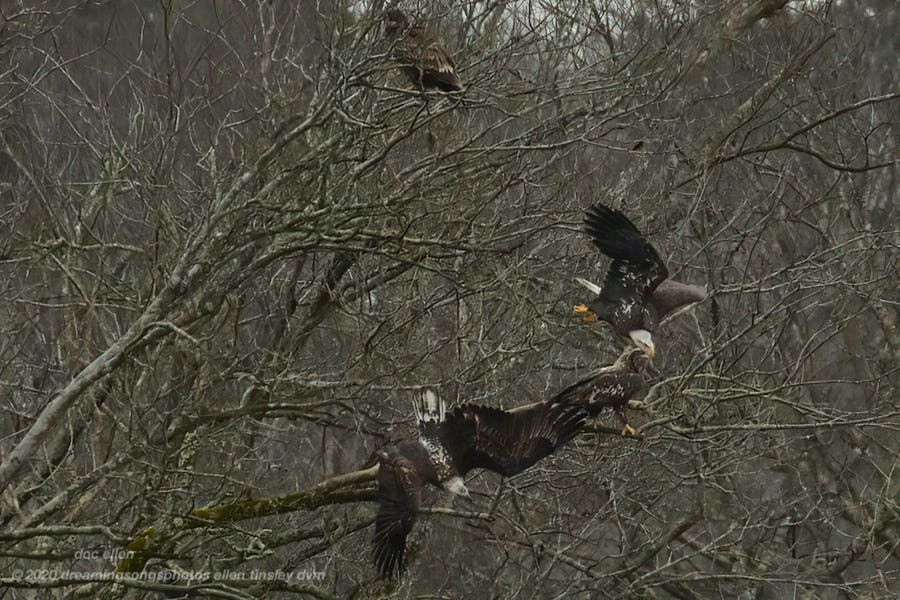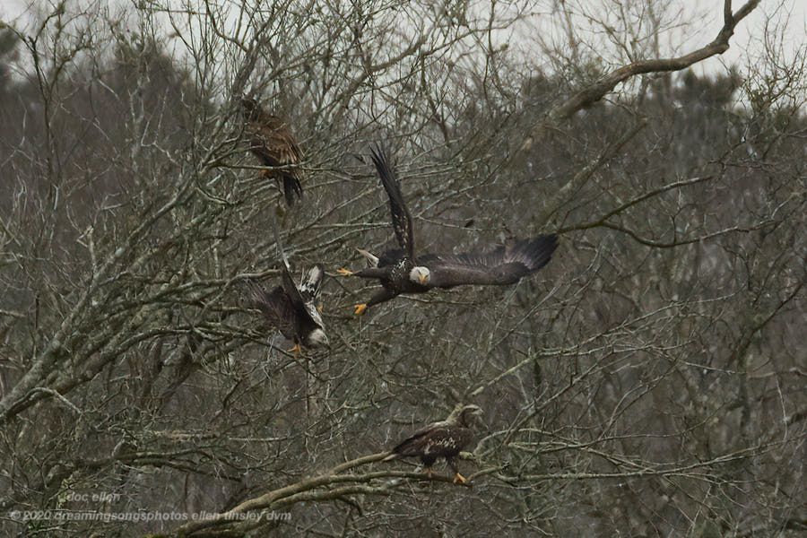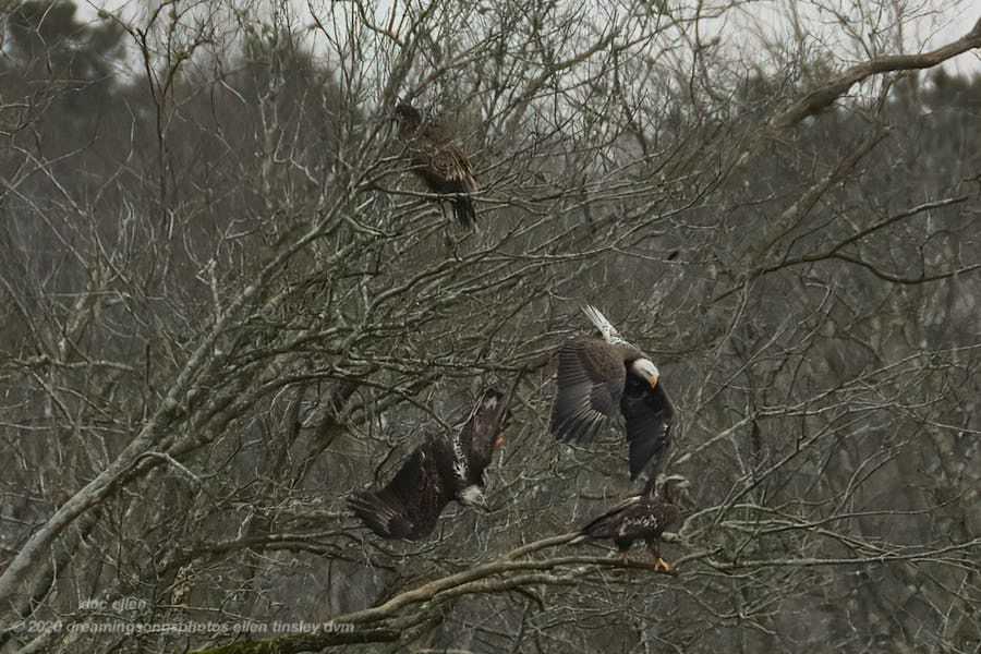 Every winter bald eagles become more or less communal. More or less. They will kind of share trees even if they are not next of kin. Sharing fish, no way! In the photos the 4 immature eagles are: the furtherest up and behind everybody is a yearling. The tumbling 3 year-old eagle to the left purposefully knocked the 4-year-old eagle off the perch that they both wanted. A 2-year-old watches the melee. If you would like help in getting the best possible shots of the Gathering, please consider taking one of my classes seen at this link: https://www.docellensphotography.com