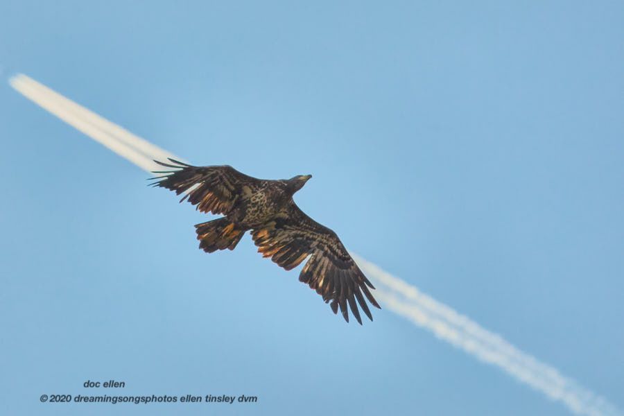 I watched the 2-year-old bald eagle break away from the group of eagles that were squabbling down river. As he climbed upwards I realized he was going to intersect the contrail of a very high jet. I thought about how ragged the eaglet looked. He was still using the same flight feathers he had left the nest with when he fledged, and there were now gaps as the new flight feathers were beginning to emerge. He appeared to be racing past the jet and I cheered him on towards a third year of life.