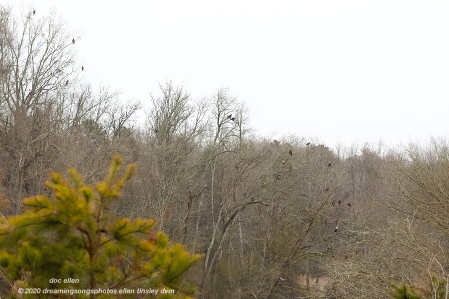 CHALLENGE for a rainy Friday evening! There are 26 bald eagles in this photo I made this morning from the MID-POINT of the riprap. Can you find all 26 of them in the photo? If you go to the lake to look, remember that MID-POINT distance because if you go further down the river riprap, the eagles will go further down river and you won’t get to see the glory of the Gathering. Keep at least 330 feet – a football field distance – away from non-breeding bald eagles. Take your chair, sit, wait, the eagles will come to you. Thank you for your patience and good seeking for the 26 eagles!!!