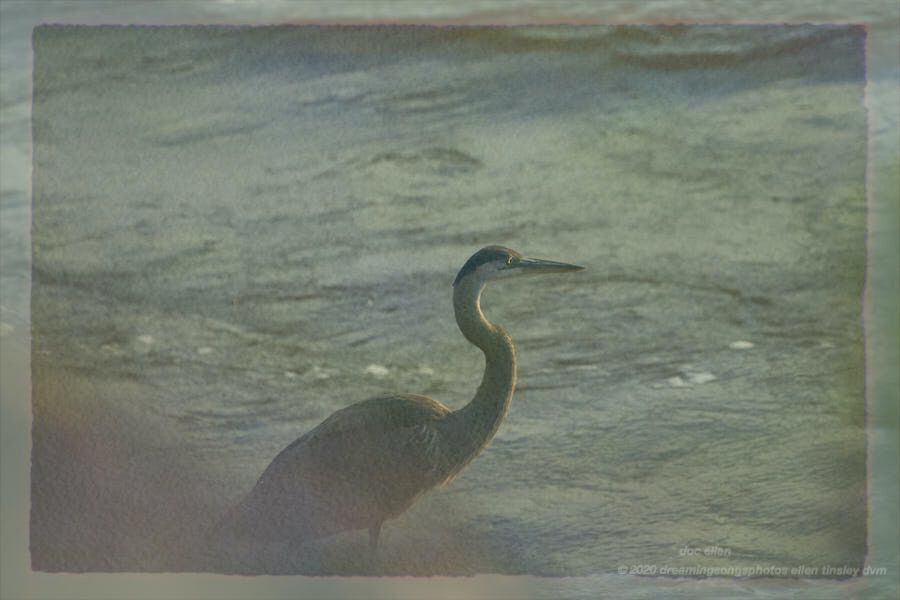 Born this spring and fledged very recently, this great blue heron muses thoughtfully for one so young. As the first day of his first summer slides gently into night, I pray. Pray that he is there to greet many more days of fishing and nights of reflection. Peace and grace, Doc Ellen