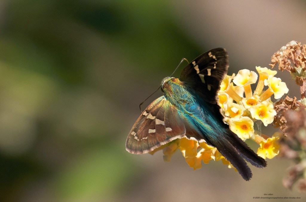 Jordan Lake Dam, Haw River: I had to stop going through the more than 200 photos I took of this butterfly this morning and share this long-tailed skipper with all of you. I have never seen a long-tailed skipper before. I understand from some reading that some years this skipper is fairly common here and then some years go by where there are only one or two seen. It tends to be a further south critter. It really is that iridescent! Now, back to going through the rest of the shoot.