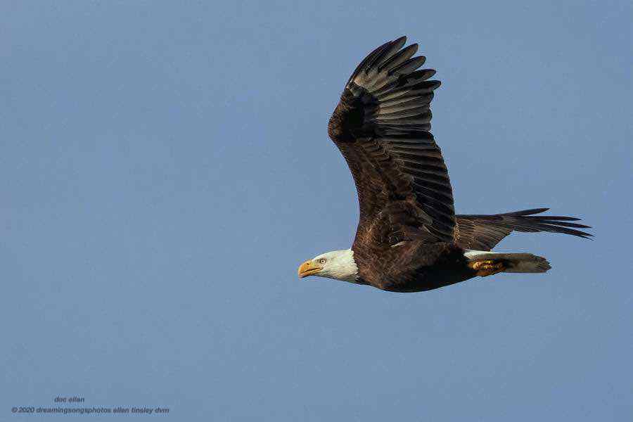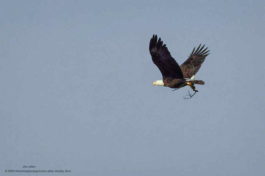 Jordan Lake: Bald Eagle Nest Report: H&G NestI watched Dad Hershey go past with a large, rather branched repair stick for his nest. Not more than 200 feet behind him came Mom Godiva. More often than not it is the dad bald eagle that carries the branches and mom who does the reconstruction work. But, I have seen moms carrying sticks and dads hard at work patching the nest. Good to see the work going forward for the breeding season.