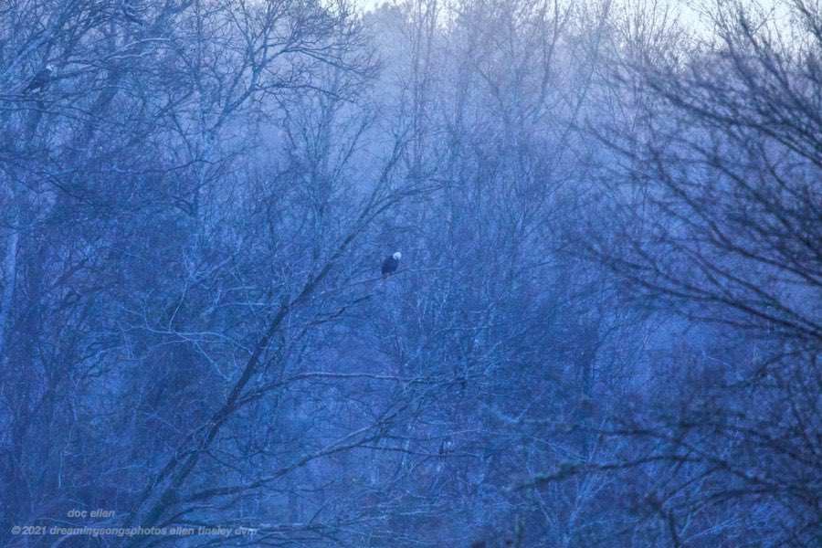Jordan Lake Dam, Haw River. We held our quarterly Jordan Lake bald eagle count this morning, from 7:00 to 8:30AM. There were eagle counters at various points about the lake. I was at the dam. I am still compiling my numbers and observations. I did want to share with all of you this scene from this morning during the count. Sometimes the amount of fog/mist and the angle of the sun as it rises, bathes the world briefly in blue. It is magical when it happens. There are 4 bald eagles in the photo.