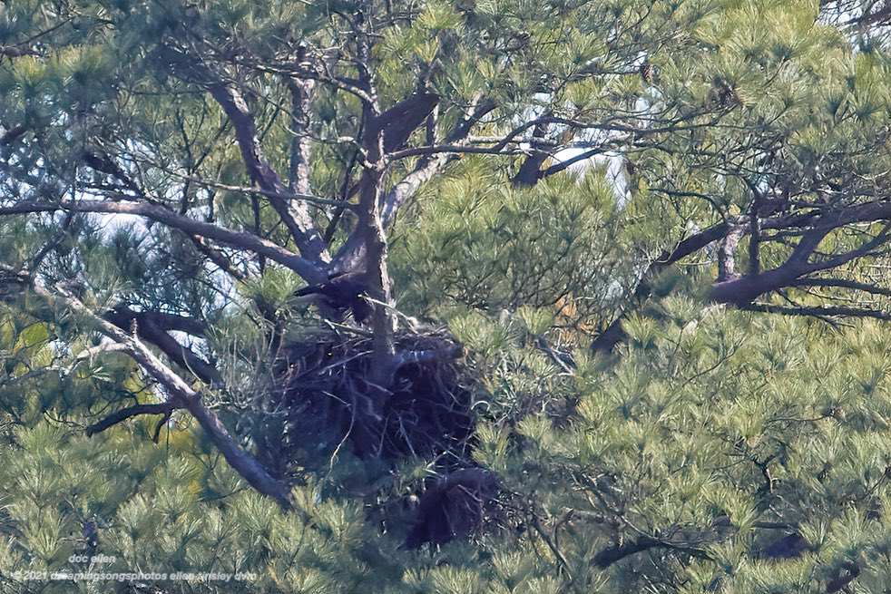 Jordan Lake: Big Pine bald eagle nest. My first glimpse this breeding season of BALD EAGLE CHICKS! Big Pine nest is one of our new nests, established this year. Mom’s tail is to the left in the nest and you can see a sliver of her white head feathers against the big upright limb at the center of the nest rim. The TWO chicks are to the right of the limb that is hiding part of mom. One chick is right against the upright limb and one chick is much easier to see with its fuzzy light grey head just above the small slanted limb. The chicks are probably 2-3 weeks old. Yay! Chicks!!