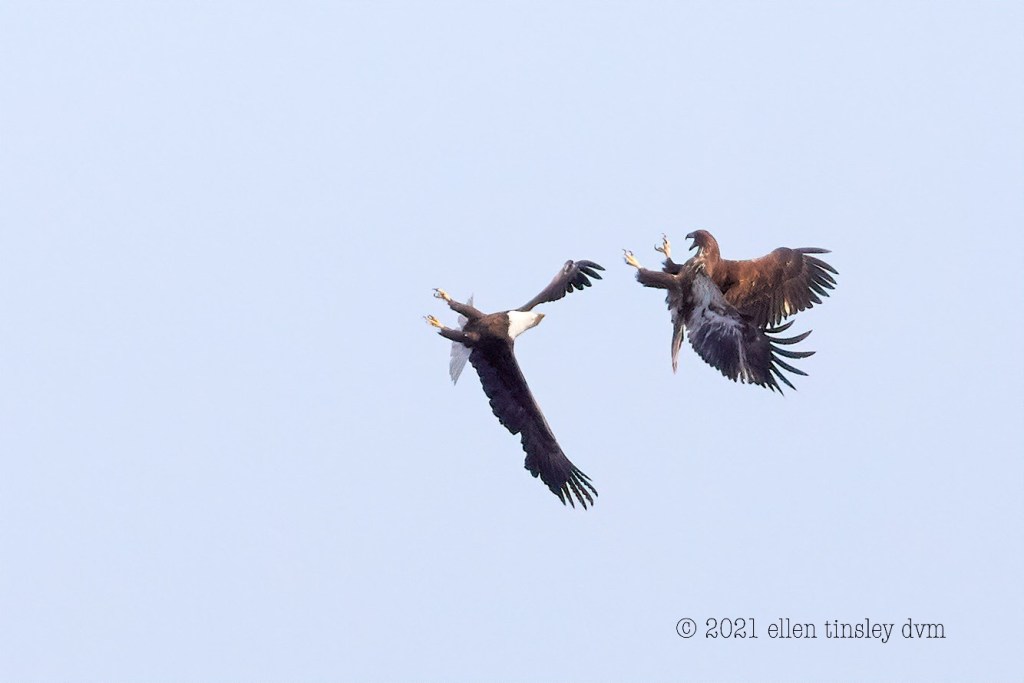 Jordan Lake: winter weather makes bald eagles feisty, just plum full of themselves. The yearling bald eagle on the right was sure that there were no boundaries on its flight, anywhere in the sky it wanted to fly. Its arrogance only lasted for a few moments once the parent bald eagle on the left said oh no you don’t play any where near my nest! The aerobatics only lasted a few seconds and the baby went right and the parent went left. Awesome to see!
