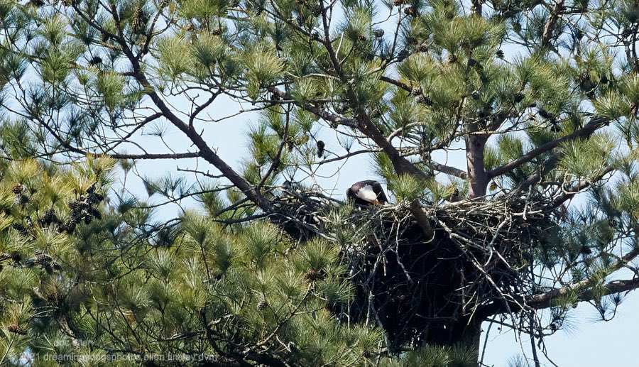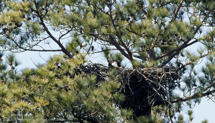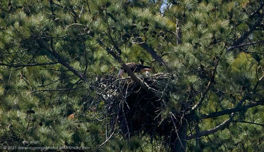 You can see the almost white-colored chick stretching up towards his Dad’s tail while Dad is pulling a piece of fish free to feed the chick.