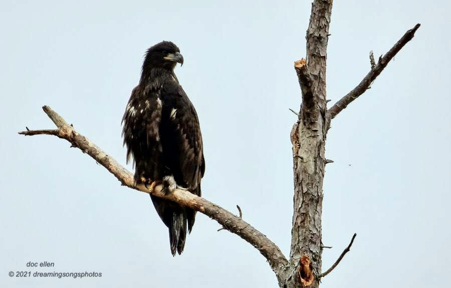 Jordan Lake Bald Eagle Nest report: The Big Pine Tree nest has a new fledgling. He looked like he might have gotten wet in a fishing attempt. Sure appeared to be upset because he had no fish and was now wet to boot!