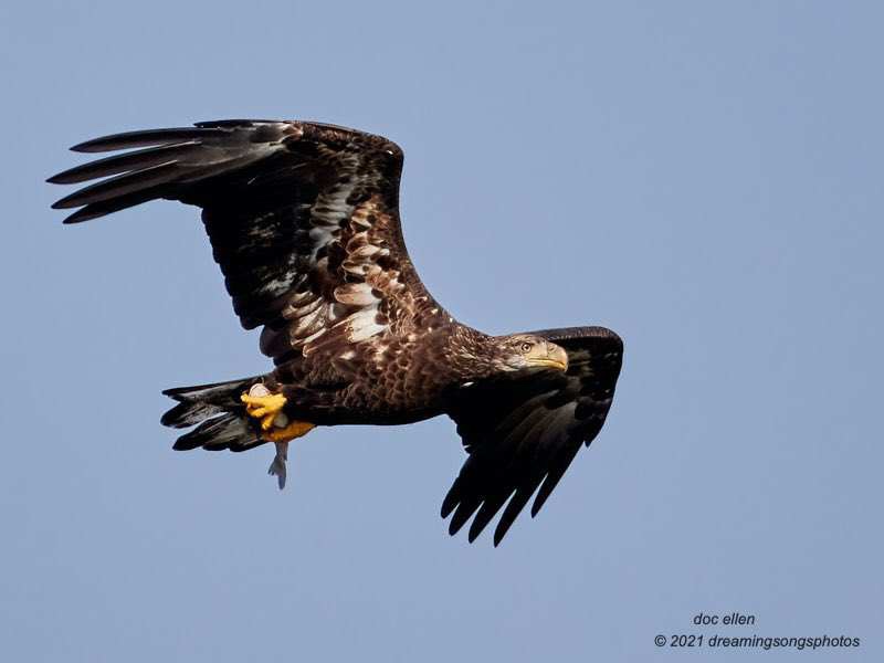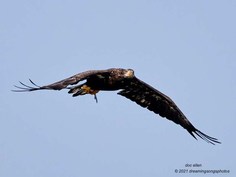 Jordan Lake, Monday, August 2, 2021. Lake level was at 216.09 ft. I was talking with one of the Rangers this morning, when this three-year-old bald eagle showed up. She glanced over at us. Didn’t see anything about us that seemed to worry her and so she turned her head away and kept right on flying. She is carrying what appears to be a very small catfish for her breakfast.