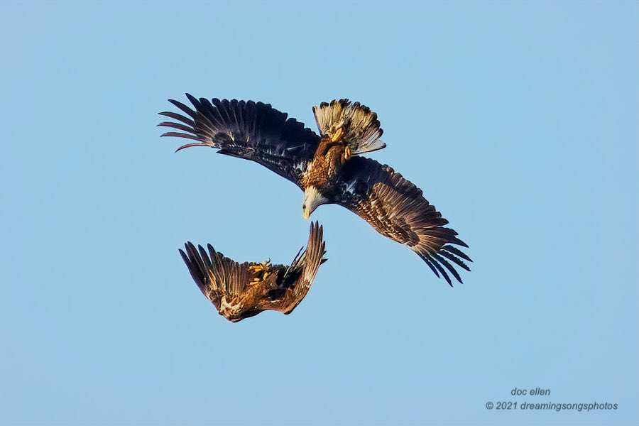 Jordan Lake. These two young bald eagles came boiling off the shoreline way to my left. You are seeing the third of the rollovers that occurred in front of me as the two bald eagles passed by. That is a four year old bald eagle that’s being really aggressive and the one that’s upside down is a three year old bald eagle. They were still tumbling and jostling for supremacy when they went screaming around the corner and out of sight.