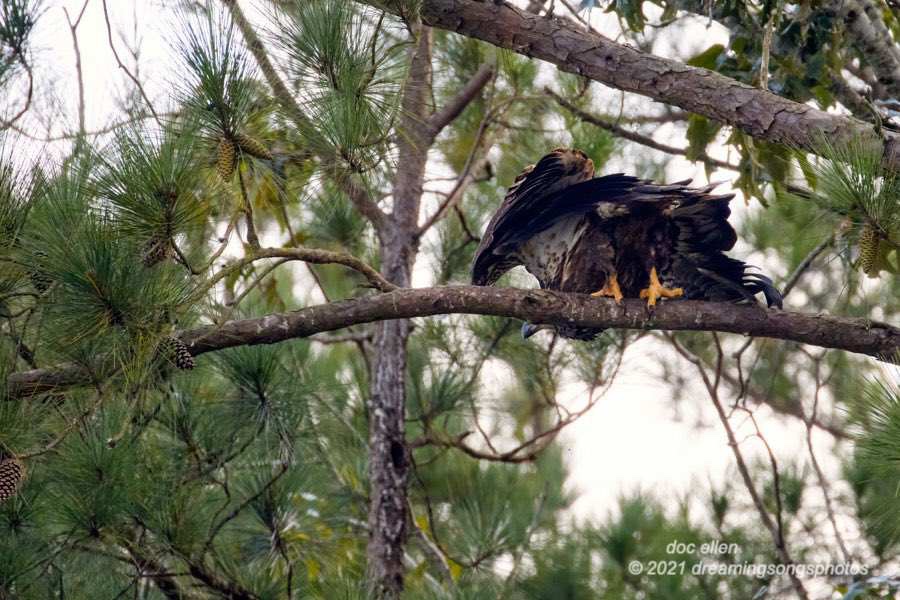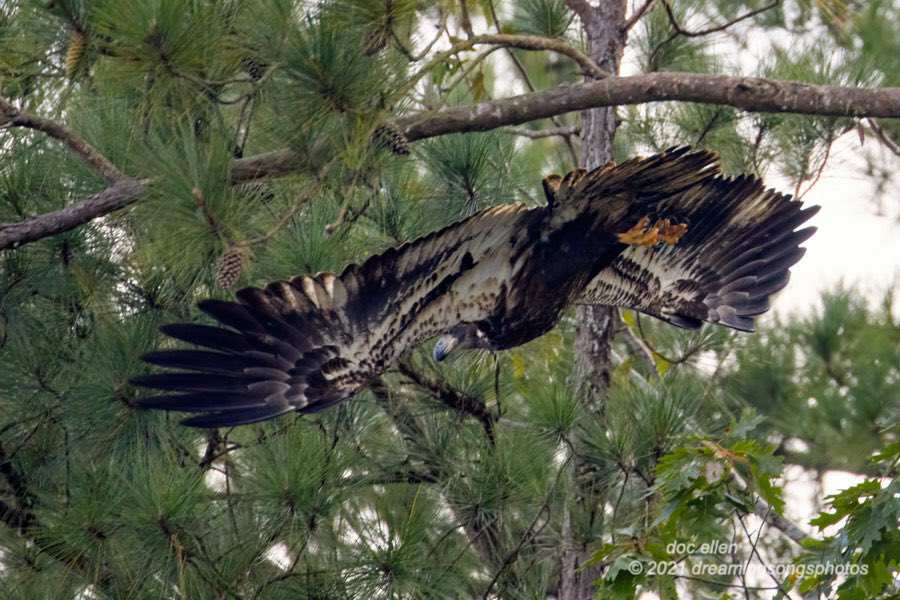 Jordan Lake: Bald Eagles are impressive … even when leaping away … and you get a different point of view. This fledgling glanced down, tilted and did a powerful launch from his perch.