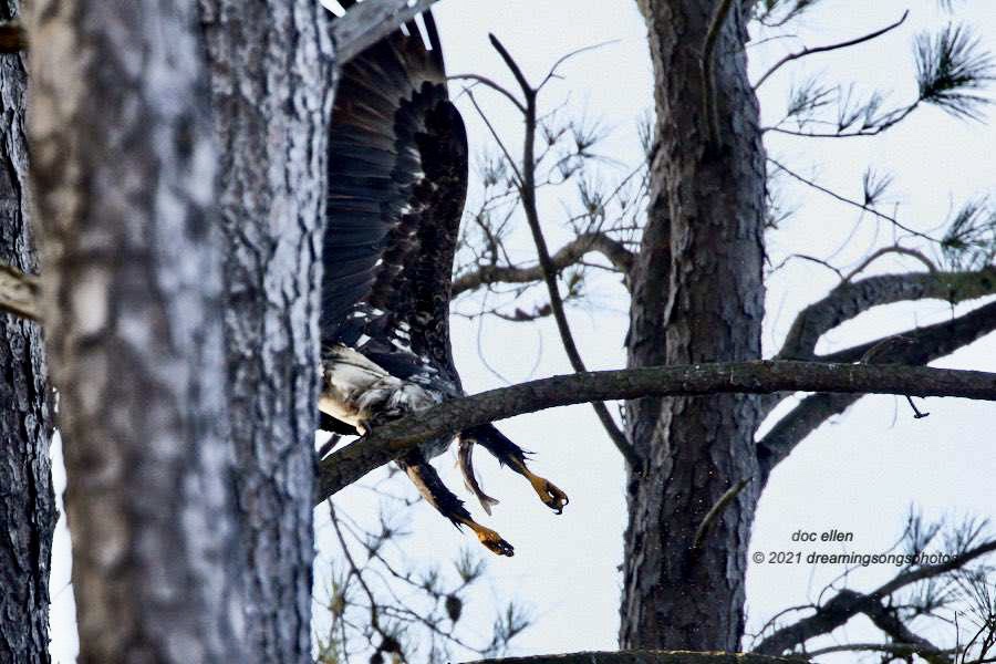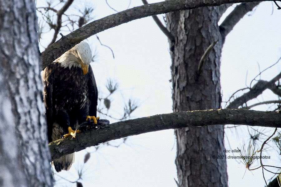 Jordan Lake: it had been a frustrating morning for my friend Bill and I. Fog and more fog everywhere. As the morning air started to clear up, a few birds started to appear and then out of the corner of my eye I saw this four-year-old bald eagle fly in around the corner, land on a limb about 100 feet from us, and it started to eat its catfish. Neither Bill nor I breathed. We leaned as far around as we could without moving from our places and began photographing this beautiful bald eagle. According to the timestamp on my camera, the eagle stayed with us for right at two minutes. Then, off it went taking its fish and Bill and I breathed again.