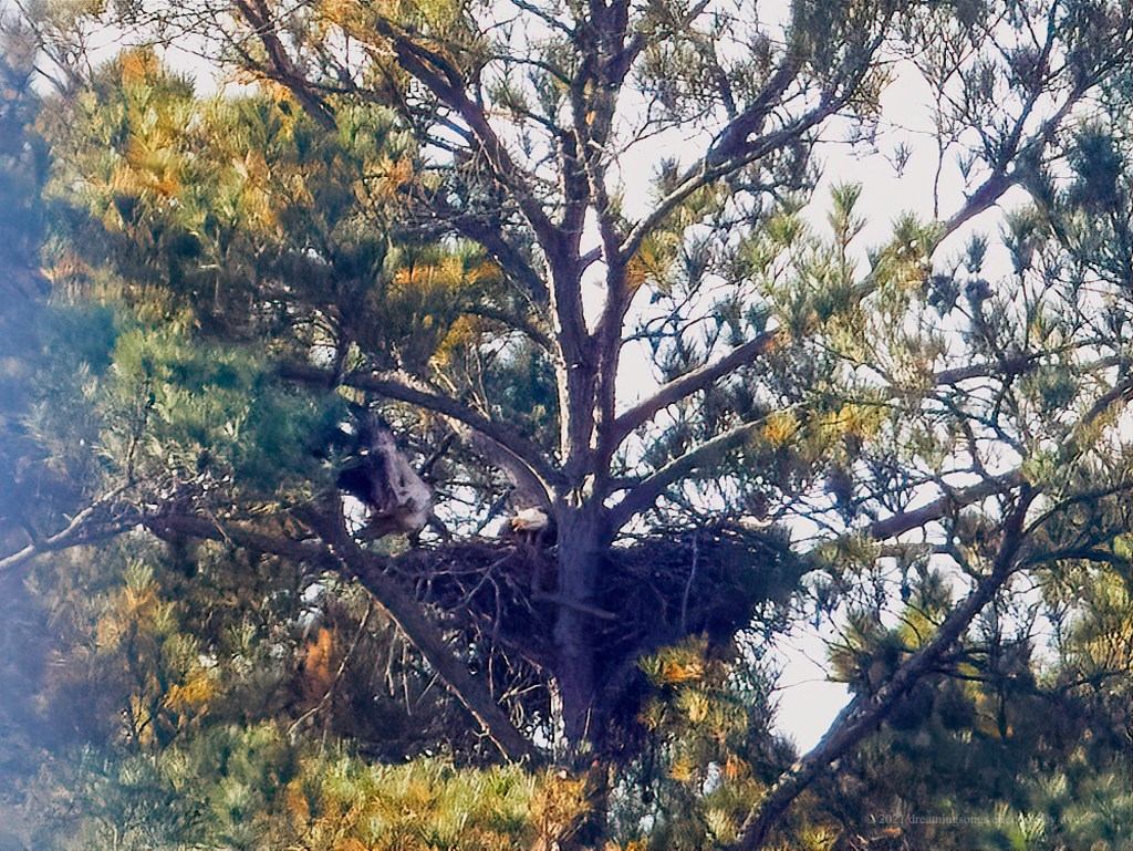 Jordan Lake, Bald Eagle nest report: H&G nest. I watched as Mom Godiva flew past me with some kind of bird in her talons. She had just gotten past me when I realized there was another eagle trailing her. By time I caught up with the other eagle it had started to land in the nest – almost on top of Godiva. It was one of the fledglings from this year‘s hatching at H&G nest. Mom Godiva was not going to have anything at all to do with the offspring. As you can see she promptly threatened it and said no way are you sharing this bird. The fledgling bailed out. Most parent eagles have finished any supplemental feeding of their offspring by about September. This youngster tried for food and it didn’t work. Please remember, nature is never cruel but she is harsh.