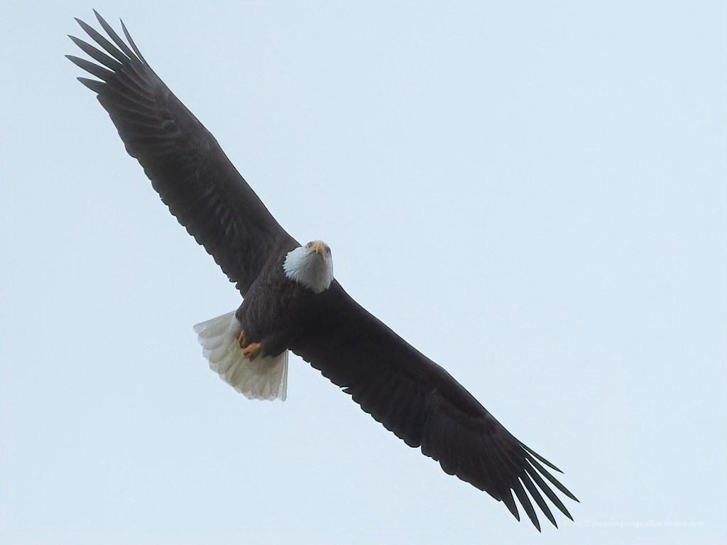 I began to realize as this past week went on, that there were no Nest Lining Materials that were trying to be brought to the nest by Mom Loblolly and Dad Pitch. This is critical because it was telling me that I needed to double check my possible egg laying dates. The nest lining materials are the last materials that go into the nest before Mom Loblolly lays her precious eggs. I was seeing lots of repair sticks trying to get to the nest (and often diverted by human intrusion) but no talons full of clutches of soft grasses. These grass materials, usually scooped from shorelines where the waves have stacked up these soft stems, are used to line the inside of the nest. This lining is then wallowed out and arranged by beak by Mom to make a protective nest bowl for the eggs and for the comfort of the incubating parent. So, over the last day or so, in consultation with the observations of others and their thoughts, the possible egg-laying date has been modified to February 1. Now, that gives us a little extra time to work on getting the gate closed so these parents are no longer harassed. It is always interesting when working with a new nest of only one prior breeding cycle because the parameters are just not really known until you have a couple of breeding seasons to use for data sources – that’s why field notes exist! So breathe a little tiny bit easier with me and let’s continue the CAMPAIGNING to get the gate CLOSED. There is now ADDITIONAL CONTACT information for you to use … it is available on the post for January 8 and the link to the same list with active hyperlinks is at my blog site https://docellensjourney.com/2022/01/08/help-big-pine-bald-eagle-nest-a-dozen-contacts/(opens in a new tab)! 1st photo is Mom Loblolly, 2nd photo is Dad Pitch this morning circling over their nest.