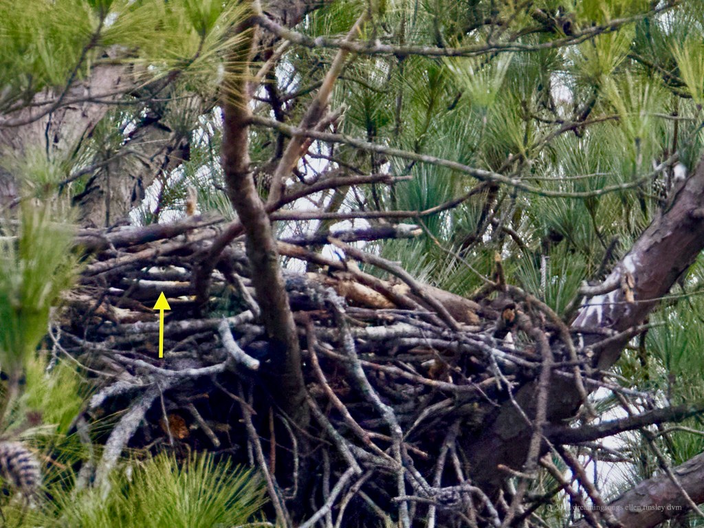 Jordan Lake: Eggs have been laid! This afternoon the Captain and I were out on his boat doing nest checks. This photo was made at a distance of an eighth of a mile – 660ft. You cannot see this view from anywhere on land. So please remember that and let’s remind everybody to not actually enter the shelter area. In this kind of cold weather if either parent comes off those eggs and leaves them for even a few minutes the eggs will die. An attempt at getting a sighting or a photo from land is not worth the loss of a single egg. You have to look carefully to see Dad Pitch’s eye through the branches – the yellow arrow is just below his eye. Dad is small and sits down low in the nest.