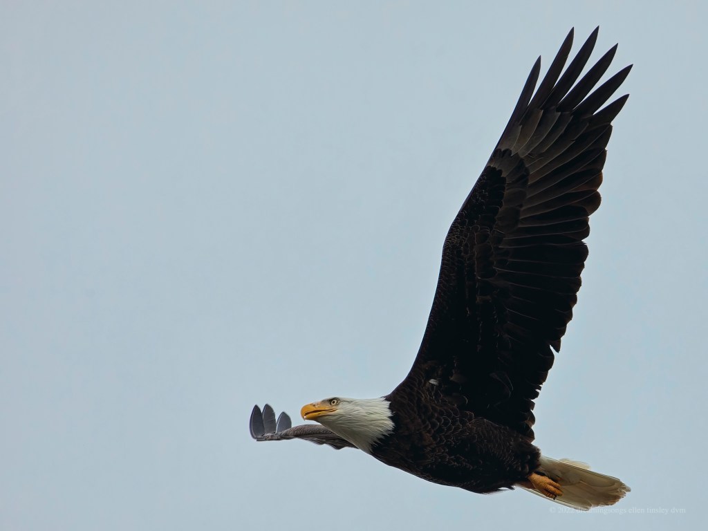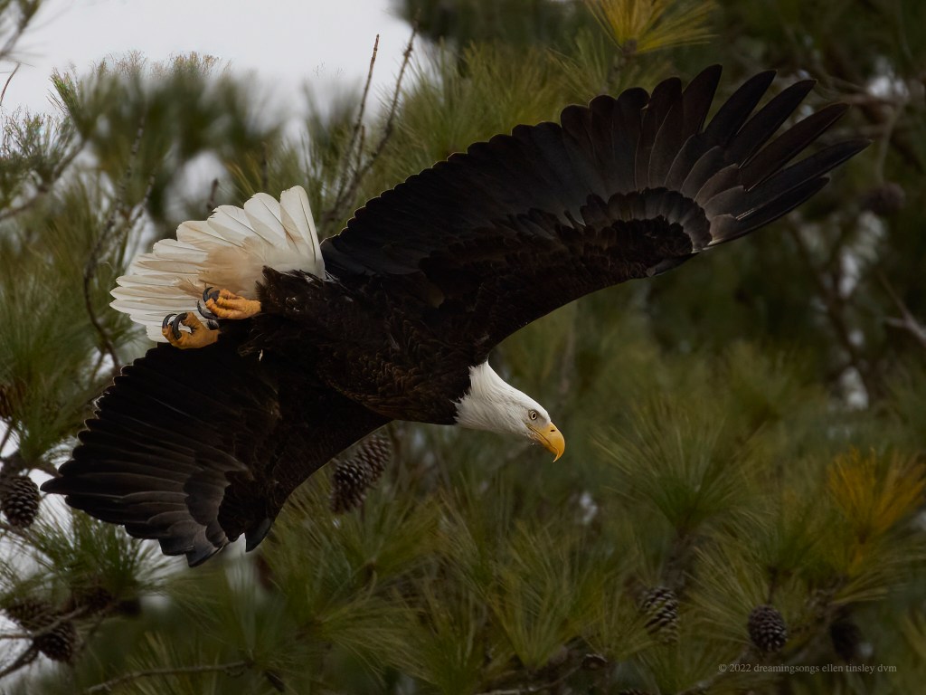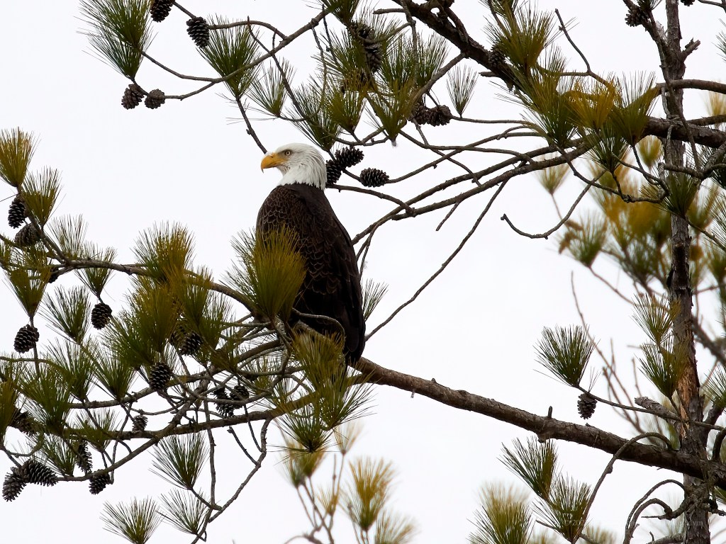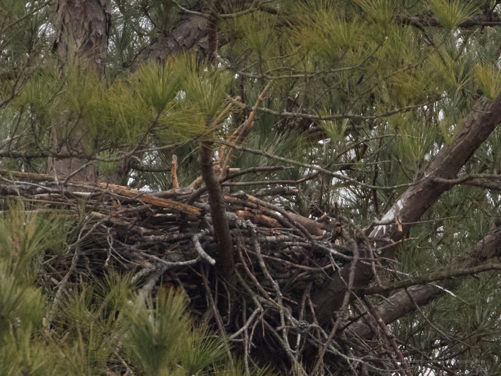 Jordan Lake. The Captain and I were out on the lake yesterday afternoon doing bald eagle nest checks. We came across this unknown adult bald eagle sitting at the northern Sentinel Point for the Big Pine Nest. I did not recognize this bald eagle. Notice that this eagle has feathers growing out of her nares/nostrils. Quite a distinct marking, yes? We saw this eagle at 1:28 PM. We went wandering off to check other nests around the lake. At 2:24 PM we came back around to Big Pine Nest and there was mom Loblolly sitting where the unknown eagle had been perched earlier. While we were watching, as you can see, mom jumped off of the Sentinel Point perch and went barreling down the shoreline, turned sharply past the nest and disappeared in the tree line. I was trying to photograph the little speck of Loblolly in the tree line, when back around the same track that mom Loblolly had taken, came that same unknown adult bald eagle (the one with the nares feather). The unknown adult went zipping right past the nest and headed north up the lake. Dad Pitch stayed hunkered down on top of the eggs, protecting them. Very interesting episode! Hard enough on Loblolly and Pitch that humans are intruding, much less having another adult eagle show up in the area!