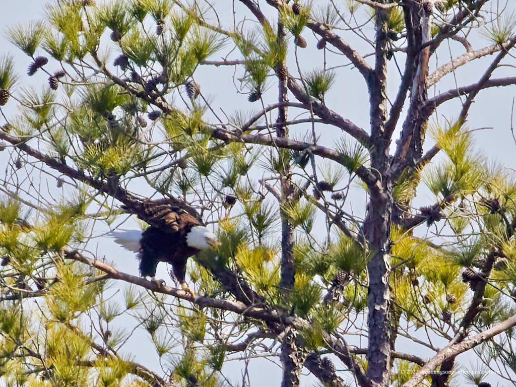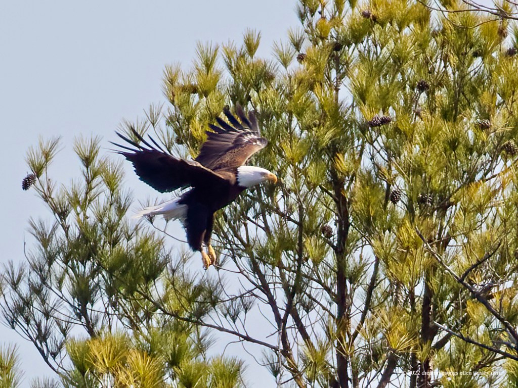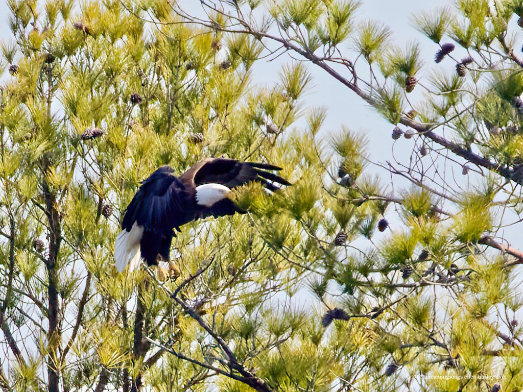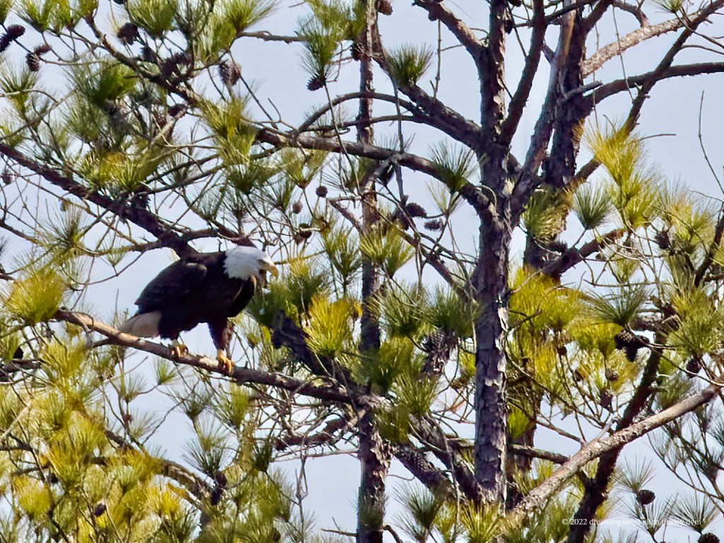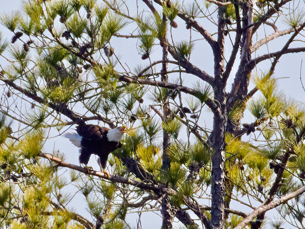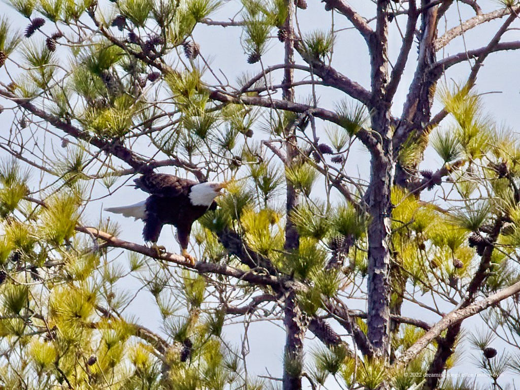 Jordan Lake: Two park visitors crossed inside the protection boundary at the shelter building this afternoon. Mom Loblolly went yelling up into the air and circled several times before coming in for a landing way north of the nest. An angry bald eagle comes in for a confrontational landing with its feet dangling … ready to strike in any direction. Usually bald eagles land with feet up and forward to catch the branch. However in this case, we know mom bald eagle was not chasing another bald eagle, but was trying to frighten off the humans. It is very rare for a bald eagle to actually attack a human. The bald eagle parents’ ultimate defense is to simply abandon the nest – I sure hope Loblolly and Pitch don’t react in that way. Mom Loblolly was protecting her nest the ancient bald eagle way but the people didn’t care or react to her efforts. After about five minutes or so the people got in their car and left. I ached for Mom Loblolly and Dad Pitch … that they are still being harassed by humans.