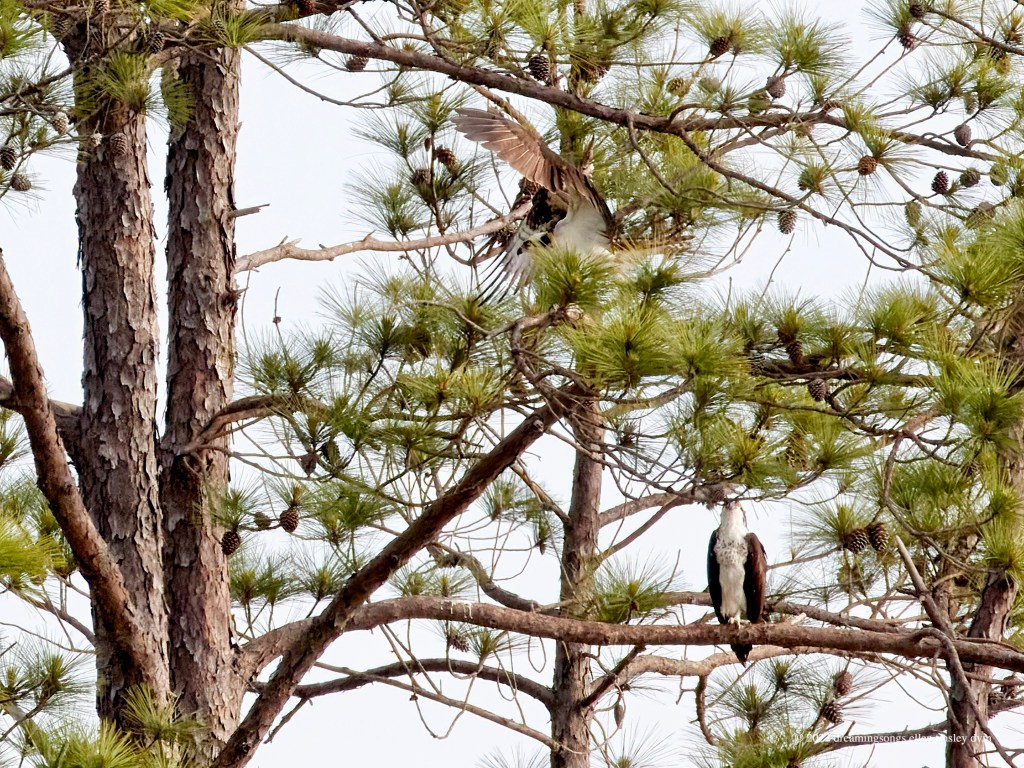 Jordan Lake. I don’t often name the Osprey nests. But given the history of this nest over the past three days, I picked a name that I know you will understand in a moment. This is the nest where the father osprey caught his wing in the fishing line on Monday. The veterinarian had to amputate part of his wing. He will never fly again. His prognosis is very poor because it’s very difficult to rehab ospreys because of their feeding habits. Keeping in mind that nature is never cruel but she is harsh, let me bring you the hope of the nest. Mom osprey was still early enough in her breeding cycle that she accepted a new male yesterday. So that is why I am hopeful. 1st photo: mom on the lower limb and her new mate up in the tree above her. 2nd photo: mom osprey. 3rd photo: dad osprey. 4th photo: the pair right at the end of their mating. I am hopeful that it works out that the season is not too late for this new pair.