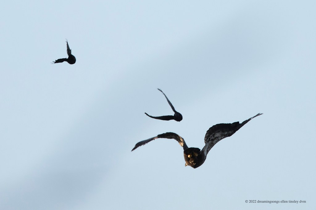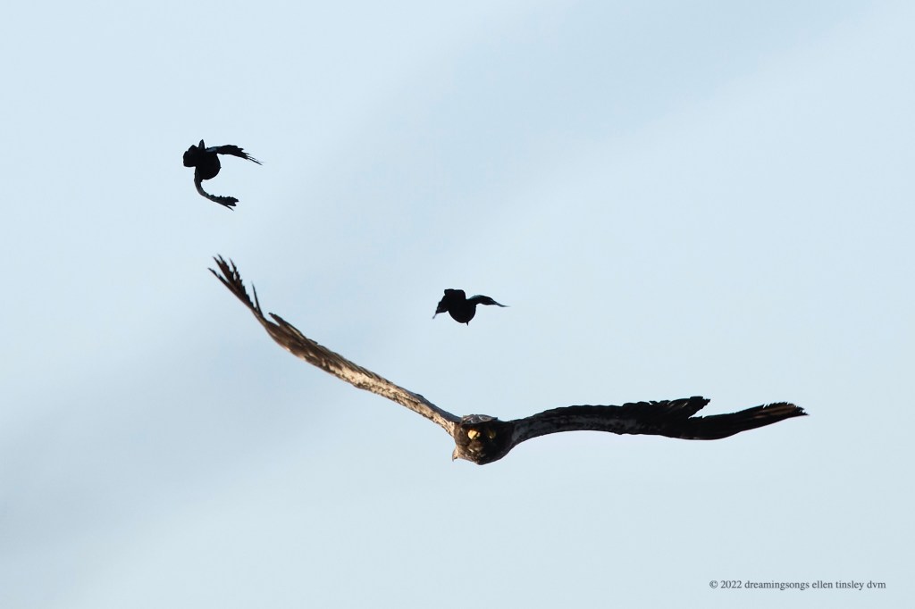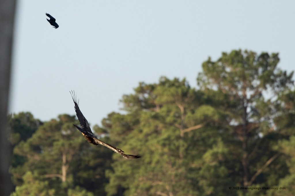 Jordan Lake. I heard the fledgling bald eagle screaming as it burst forth from the trees. Right behind the young eagle was a pair of fish crows. Apparently the eaglet had gotten too close to the fish crows’ nest. All 3 instantly banked back into the trees and I tried to follow them through the branches but they disappeared very quickly out of my sight.