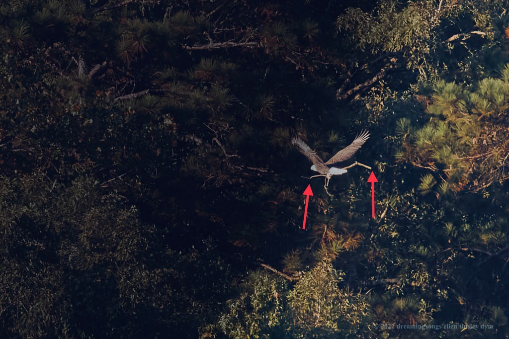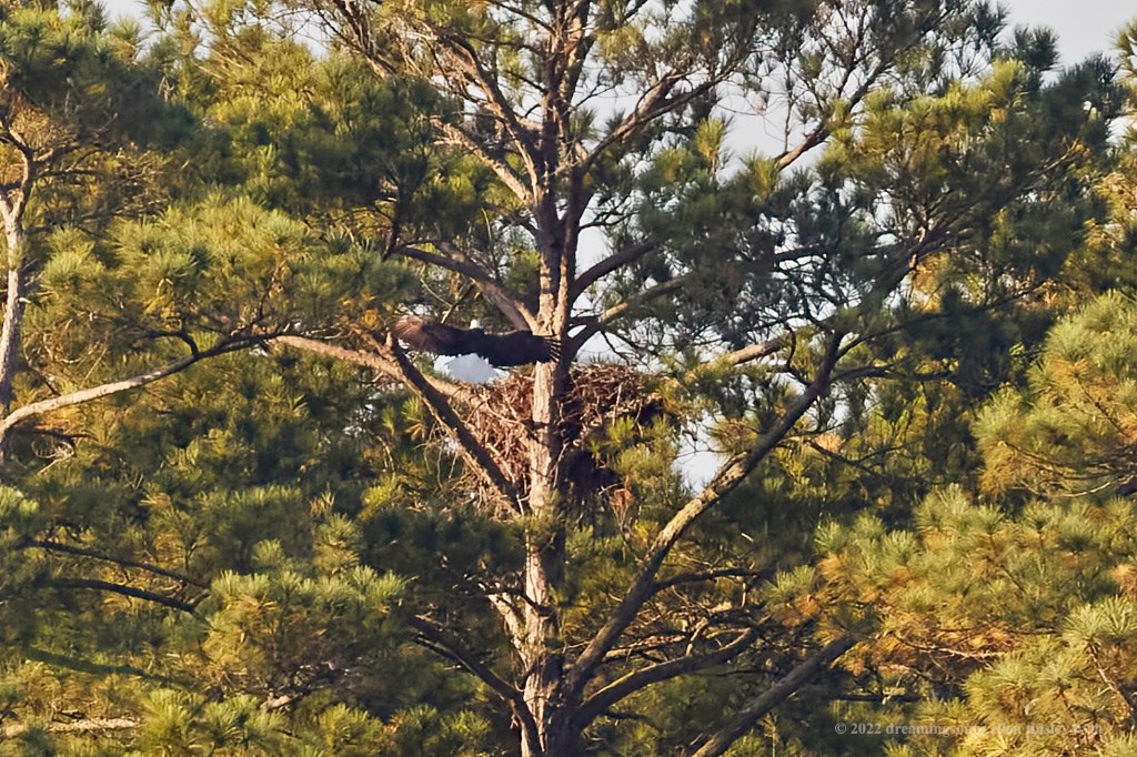 Jordan Lake. H&G nest. Bald eagle parents guard their territory all year around. The breeding season here goes from about December 1 to June 1. However the parents are prone to starting repair on their nest if they see a stick that will fit in to whatever hole needs to be patched. Mom Godiva grabbed herself a fairly big stick, hauled it up to the nest and then went fishing and got herself a snack.