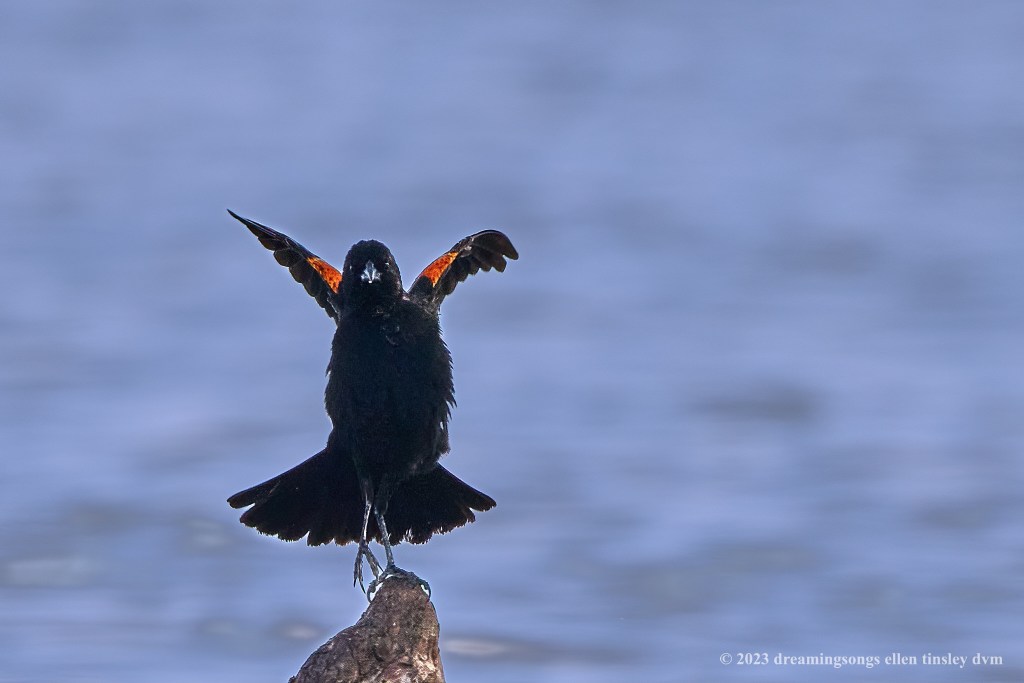 Jordan Lake. Some days, you just gotta, I mean you just really have to dare to dance on the point of a rock, says the red winged-black bird.