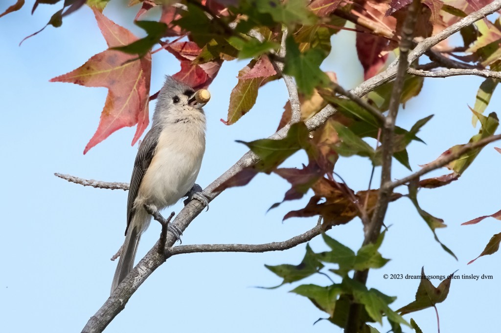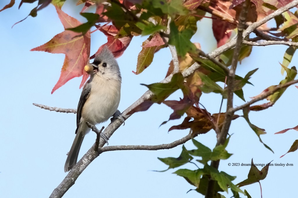 Jordan Lake. The tufted titmouse was quite proud of his acorn. He showed it off in one direction and then to make sure you saw that he had it, he turned his head and showed it off from another direction. Then the titmouse looked at me and said “oh you do see my acorn don’t you!” Then he cocked his head at a jaunty angle and smiled at the world because he did indeed have one beautiful acorn.