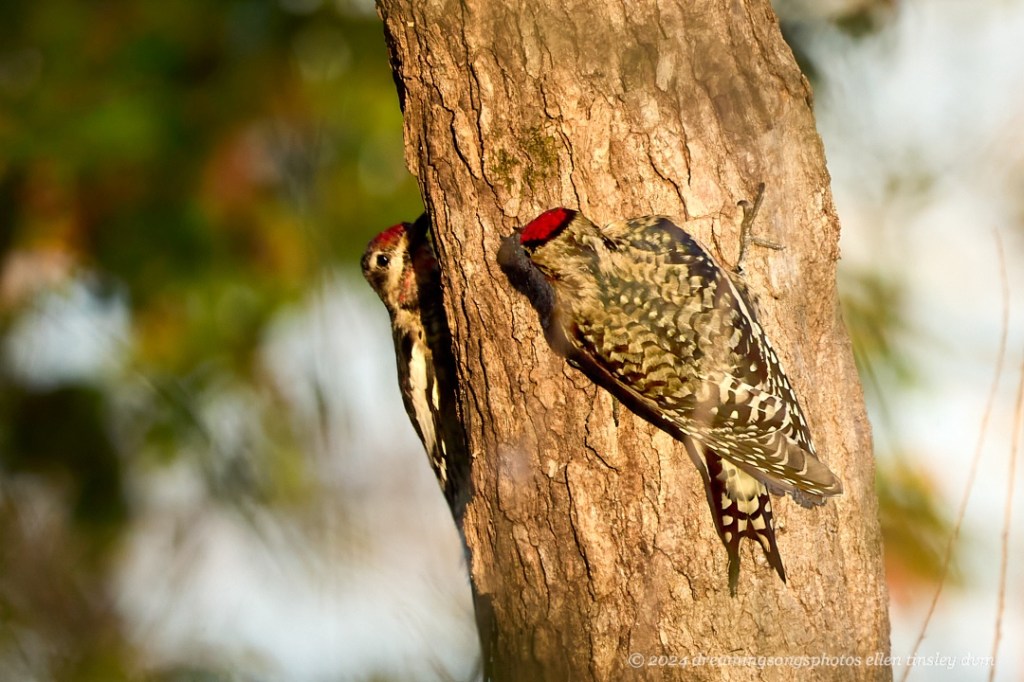 Crispy weather and brightening sunlight was filled by the game of peek-a-boo-I-see-you between two of several yellow-bellied sapsuckers at Jordan Lake.
