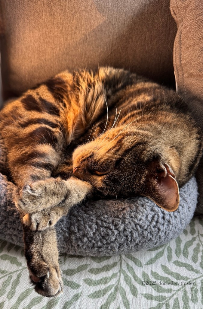 Grayced the Cat naps in the evening golden hour. I smile at his repose while thinking of all the hours he has spent comforting me in my continuing recovery. Each day I walk further and Grayced is home waiting to fill my lap with soothing purrs … while avoiding the ice pack on my knee.