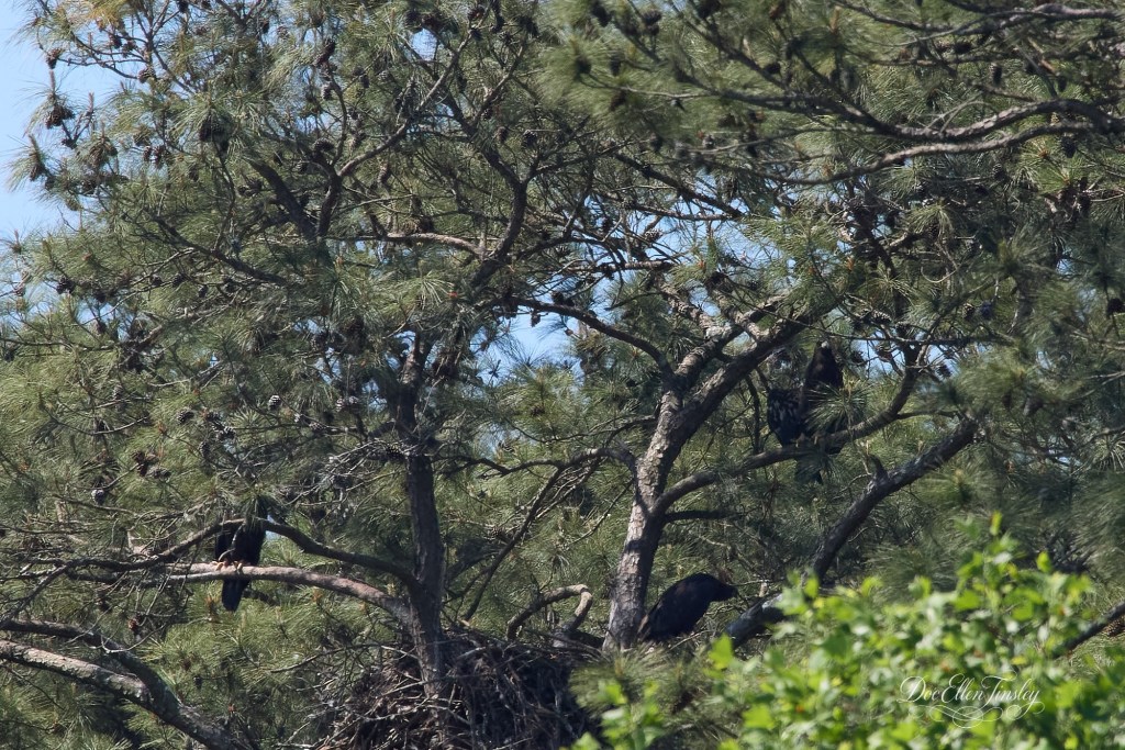 First Nest. All three of the bald eagle TRIPLETS are continuing to grow rapidly. Hint: to see each look for dark football shape, then yellow feet and for a beak. Nature camouflages these youngsters very well.