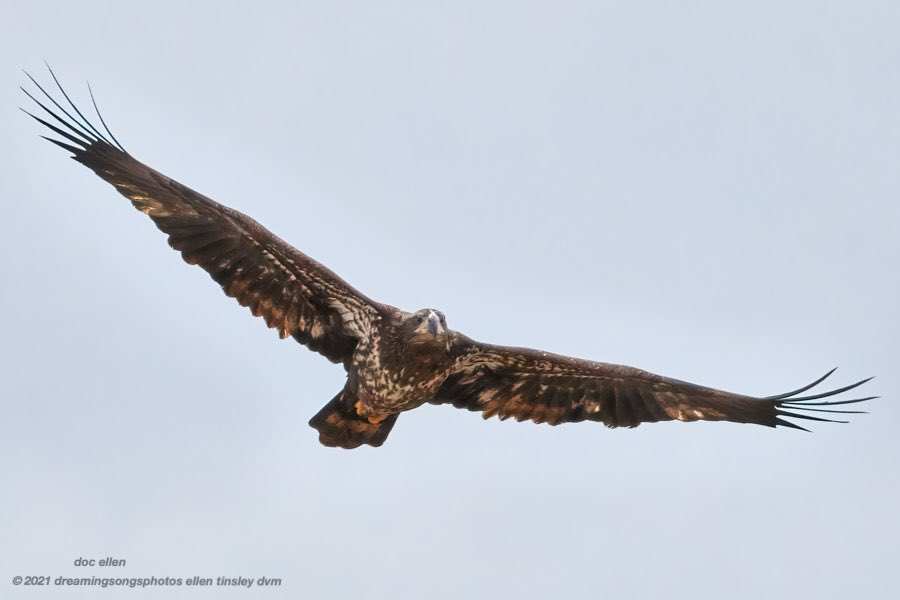 Jordan Lake Dam, Haw River. Captain Doug and I have been seeing bald eagles of all ages from fledgling through adults with feathers growing from their nares/nostrils. Usually we see a nares feather on one side of the beak or a feather on the other side of the beak. This morning this two-year-old flew past me with a pair of bright white nares feathers. Perfectly crossed across the top of his beak. It’s got to be a genetic trait here at the lake to see it in several bald eagles of all ages. Sure is neat looking bling!