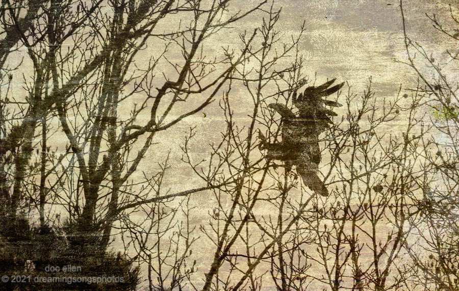 Jordan Lake Dam, Haw River: Sometimes, the 12-year-old heart of me just has to play with a photograph and find new ways to see bald eagles. Such as this 2-year-old bald eagle at the riprap this morning, in all the fog. I hope the changes let you see the concentration of the youngster as he aims for just the right branch for his landing.