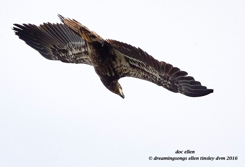 I looked up to see this ragged 2 year-old eagle soar past and head for the osprey.